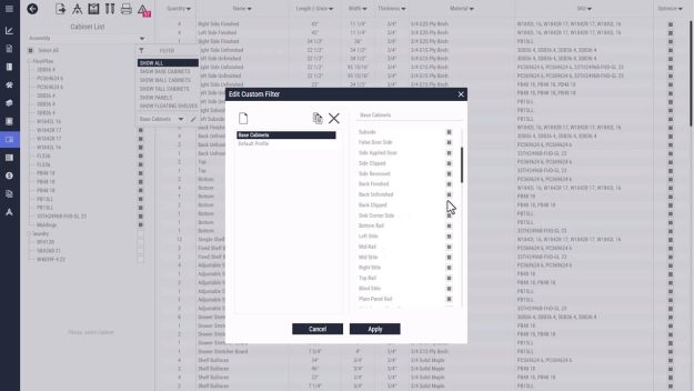 Buy Now FREE Trial Buy Now FREE Trial The Cutlist Module Part 2 Video Tutorial – 5min https://youtu.be/0QAWqrQiyqI Back to Video Tutorials custom, filter, base, wall, tall, panels, floating, shelf, list, edit, tool, feature, help