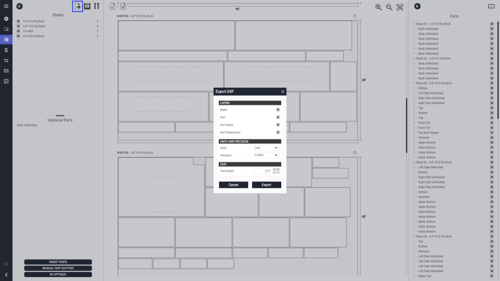 Nested part layouts (without tool paths) can now be exported through .dxf, allowing for layout import into other programs like Vectric, EnRoute, etc.