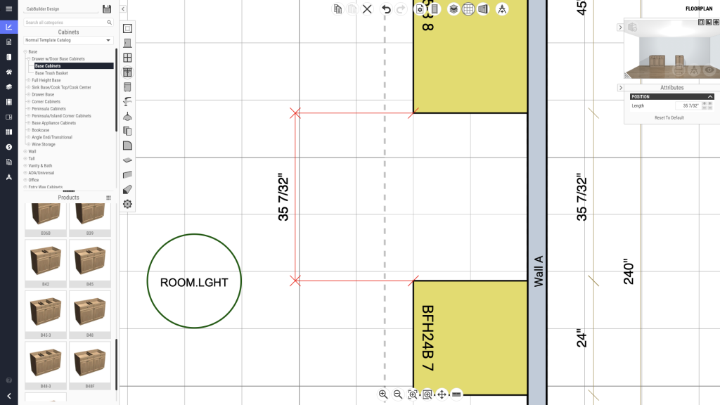 Hover mouse inside a construction line’s zone to show dimension to perimeter cabinets